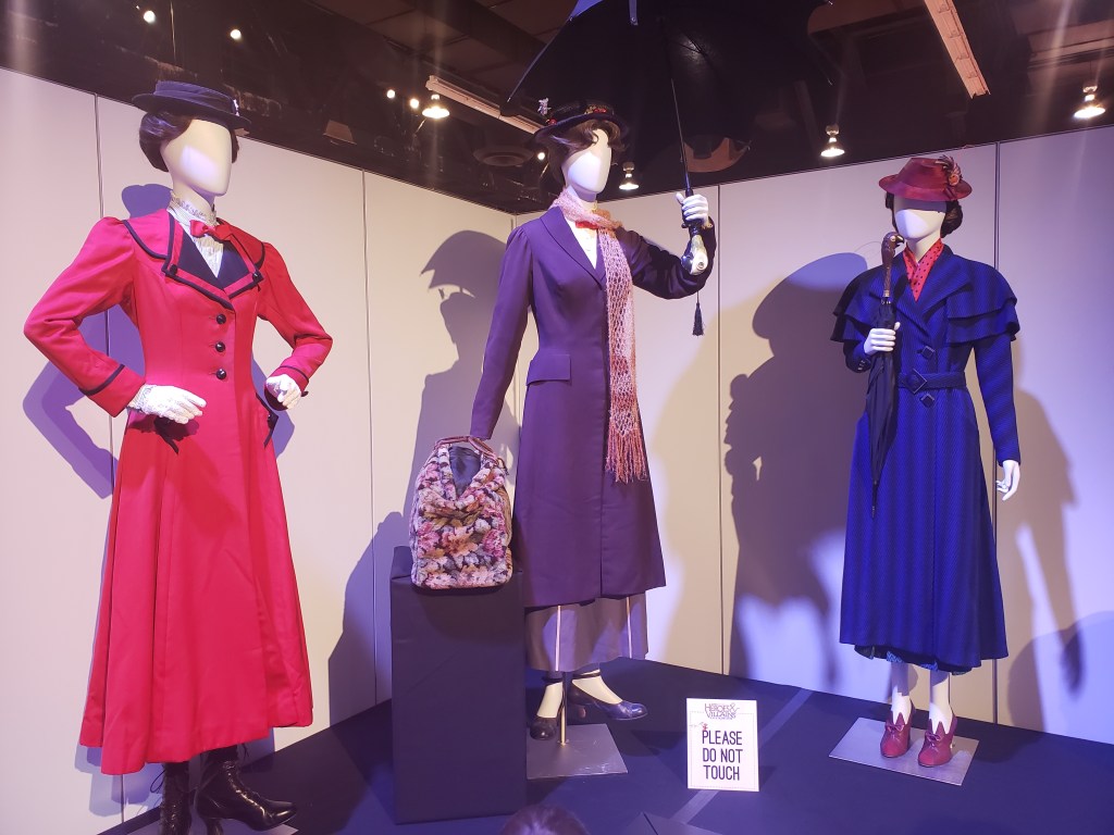 A trio of Mary Poppins costumes (Broadway, 1964 film, and 2018 film)