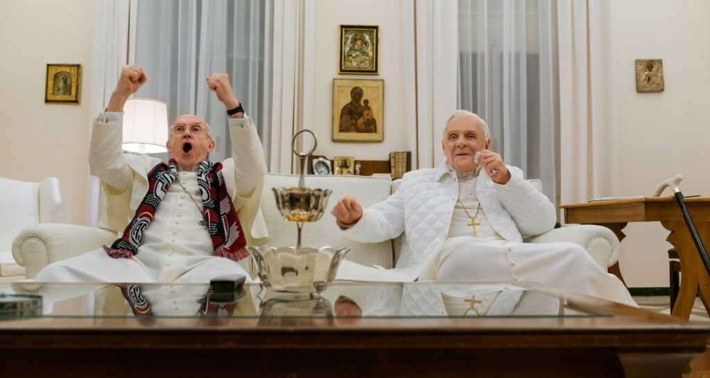 The film opens in 2005 with the election of Pope Benedict XVI (Anthony Hopkins). Seven years after traveling to Rome for the election, Argentinian Cardinal Bergoglio (the future Pope Francis, played by Jonathan Pryce), disillusioned by the Catholic Church following the Vatican leaks scandal and the handling of priests engaging in pedophilia, returns for a meeting with the Pope, where he intends to resign as Archbishop. The Pope refuses to accept Bergoglio’s resignation, believing it will reflect badly on the Church and on himself, but over the course of a couple of days the two argue and bond despite their differences.