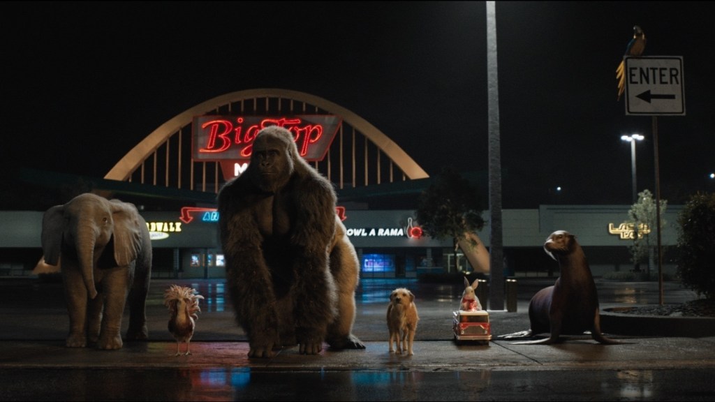 “The One and Only Ivan” is a film that frequently feels torn between several different moods and messages, resulting in it feeling rather bland and muddled as opposed to making a definitive statement. Directed by Thea Sharrock and based on the award-winning children’s novel by K.A. Applegate, the story is set in the Big Top Mall, which houses a circus run by Mack (Bryan Cranston), the star of which is the gorilla known as the one and only Ivan (voiced by Sam Rockwell). When the circus begins losing business, Mack purchases a baby elephant called Ruby (Brooklynn Prince) to draw in crowds. What initially seems like the setup for a jealous conflict between Ivan and Ruby turns into a plea for animal rights, as older elephant Stella’s (Angelina Jolie) stories about living in the wild told to Ruby conjure up Ivan’s memories of being free. At the same time, Julia (Ariana Greenblatt), the daughter of the circus’s janitor George (Ramón Rodríguez), gives Ivan some old crayons, and he decides to use his drawing skills as a means to an end. “The One and Only Ivan” is a fairly typical talking animal movie, although its voice cast (which also includes Danny DeVito, Helen Mirren, and Chaka Khan) is really impressive, and the CG animals fit nicely into the human world—not too real, not too cartoony. The characters also made some solid observations about humanity, most notably when Stella tells a story and reflects that not all humans are bad, while Ivan has a more harrowing tale from his childhood that shows the more dangerous side of humanity. The film doesn’t really commit to any of its ideas however. One aspect of the story suggests that we should revile Mack for keeping these animals in cages, but the film also makes it very clear that he isn’t a bad guy. The film starts out on a mission to save the circus, which Ivan initially seems quite happy to be in, only to pivot at the end. And we don’t see Ivan actively developing his art skills before the climax of the film either. All this to say, while it’s true that nothing and no one should be expected to be just one thing, all of these elements together in this film feel jumbled. Regardless, the film’s sense of humor and the fact that it isn’t overly deep make it a great watch for kids, and the attachments the animals form with each other are very sweet. The ending will likely have your eyes welling with tears regardless. That’s just what cutesy animal movies do to us. Runtime: 95 minutes. Rated PG. 2.5 out of 5 stars.