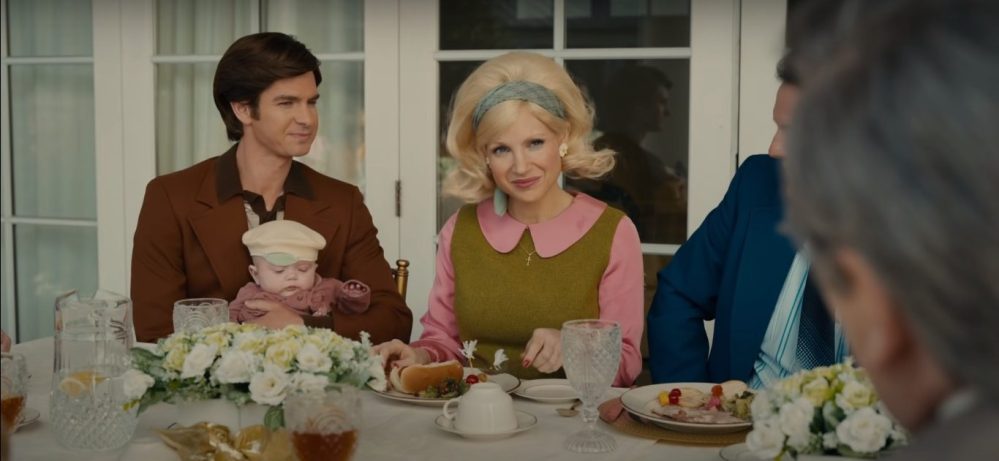 “The Eyes of Tammy Faye” opens with the facts. A swirl of news reports, photos, and headlines move across the screen, detailing the downfall of popular televangelists Jim and Tammy Faye Bakker, who built an empire throughout the 1970s and 80s with their Christian TV program “The PTL Club,” only to see it come crashing down after Jim was convicted on multiple counts of fraud and conspiracy. The scandal involved Jim paying an exorbitant amount of money to a woman who claimed he raped her to keep her silent, and prompted examination of just where and how the Bakkers were able to fund their lavish South Carolina mansion, and projects like their Heritage U.S.A. theme park.
