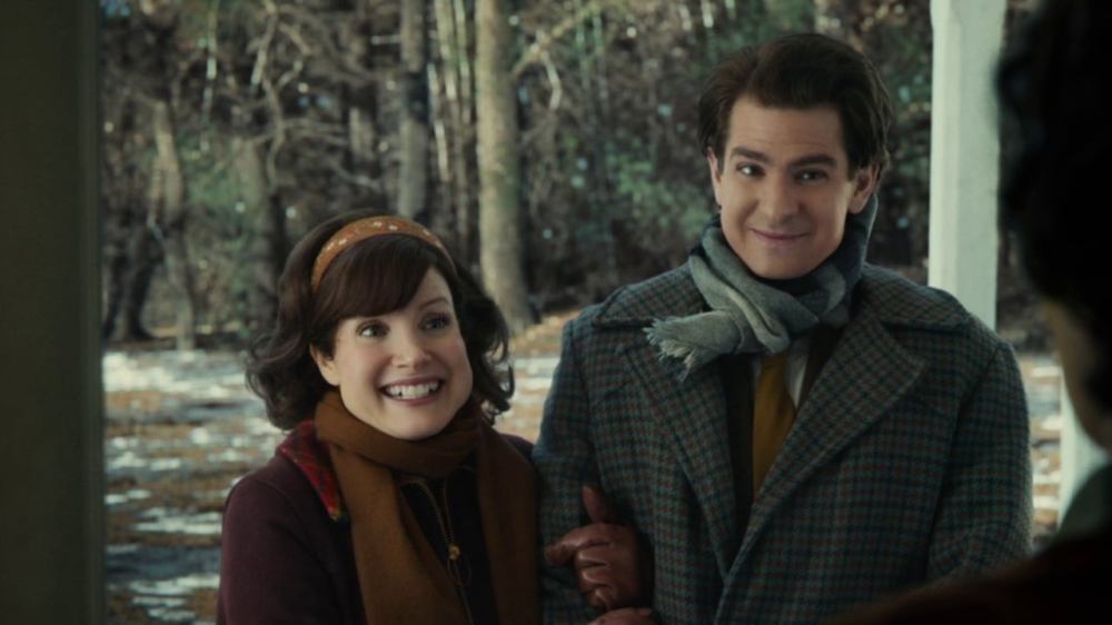 Years later, Tammy is attending North Central Bible College in Minneapolis where she meets Jim (Andrew Garfield), a fellow student. Both of them are seen as outsiders for their views on religion; Jim preaches the prosperity gospel, believing that God would want them to be rich and have what they want, and Tammy is seen as indulging too much in her appearance with the make-up she wears. The pair bond, quickly marry, and set off on the road as traveling ministers, incorporating Tammy’s singing and her puppet act for kids into their sermons. Their popularity leads them to television, where they first host a children’s show called “Jim and Tammy,” then helped found “The 700 Club,” and ultimately founded “The PTL Club,” where they were able to preach their prosperity gospel to an increasingly affluent Christian audience.
