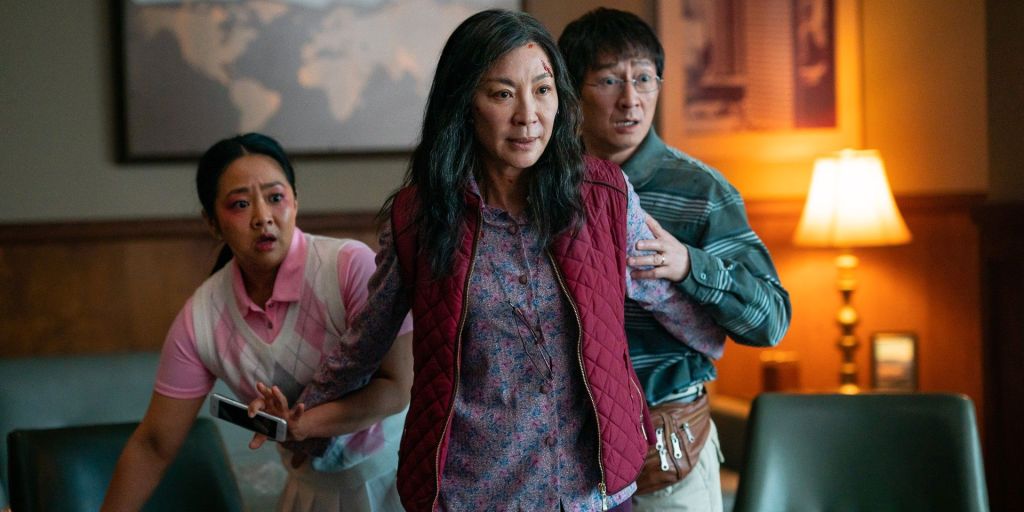 And it’s that cast that is responsible for a good chunk of the film’s success. Yeoh has been a steady presence in movies since the 1990s, appearing in films both in China and the United States, but the majority of her English-language roles have kept her in support, recognizing her talents (particularly her background in martial arts movies) but never really shining the full spotlight on her. The Daniels give Yeoh the space to be the star that she is, and she is more than up for the challenge of tackling multiple different versions of the same character, while also conveying a sense of humor and a sense of regret that makes Evelyn sympathetic even when the things she says and does come off as mean. Hsu matches her beat for beat with a performance that gets to be wacky and big during some of the wilder scenes, and frustrated and broken during the more grounded sequences. And while Yeoh gets to step into a leading role in a big way here, delivering the performance of a lifetime, this also feels like new territory for Quan, who most audiences are likely familiar with from his child roles in the 80s classics “The Goonies” and “Indiana Jones and the Temple of Doom.” For someone who has only had a handful of feature film roles in the years since then, this is Quan as we’ve never seen him, appearing in a big, complex role that is funny and sweet and really pulls on the viewers’ heartstrings (he also deftly handles the transition in personality between regular Waymond and Alpha Waymond). And by centering their story on a Chinese-American family, the Daniels craft a unique immigrant story that resonates through all the noise.