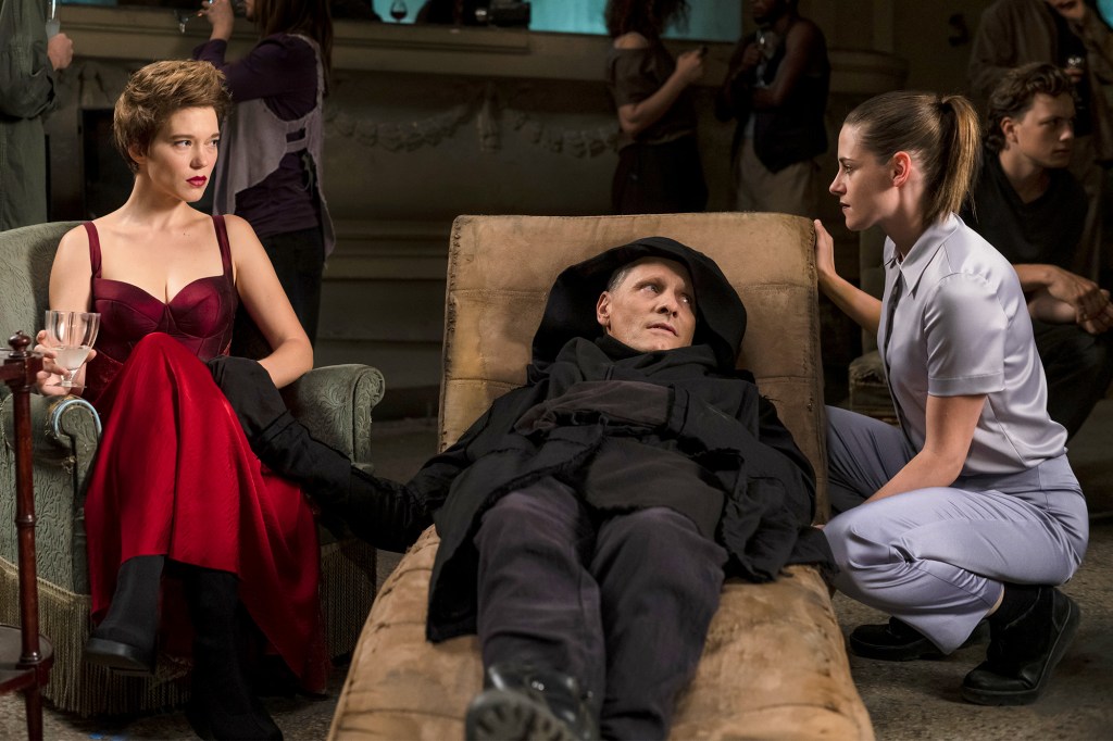 This “Crimes of the Future” bears no relation to Cronenberg’s early 1970 feature of the same name, although both share a nightmarish vision of a future where the effects of a changing environment are reflected in human bodies. In this future, humans have undergone significant biological changes. In the opening of “Crimes of the Future,” a seemingly idyllic scene by the seashore takes a bizarre turn when the eight-year-old boy we are observing takes a bite out of a plastic trash can. We then meet Saul Tenser (Viggo Mortensen), a man with what’s referred to as an accelerated evolution syndrome; his body rapidly produces new organs. A performance artist, Saul— along with his partner Caprice (Léa Seydoux)— makes his condition an integral part of his craft, having Caprice remove his new organs in front of a live audience. A through-line involving a group of radical evolutionists ties together Saul, Caprice, the young boy, and several other characters, who include Timlin (Kristen Stewart) and Wippet (Don McKellar), investigators for the National Organ Registry; the boy’s father, Lang (Scott Speedman); and Berst (Tanaya Beatty) and Dani (Nadia Litz), a pair of technicians who work for the company that manufactures the biomedical machines that Saul and so many others rely on, and who are the epitome of “be gay do crime.”