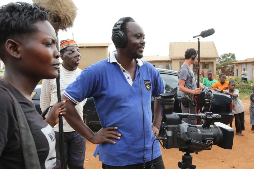 Once Upon a Time in Uganda relies heavily on reenactments of real events to portray how Hofmanis and Nabwana linked up, often with a playfulness akin to the films themselves; at one point, Czubek stages a grand chase through the market streets depicting Hofmanis spotting and chasing down a man wearing a Ramon Film Productions shirt and selling DVDs of their movies to passersby, finally convincing this man to take him to Nabwana. Hofmanis ends up befriending Nabwana and becoming a key member of his team, taking over some office duties to free up time for Nabwana to make movies and reaching out to programmers and potential investors around the world to get them to see what he saw about these movies that is so magical. Other moments later in the film—intimate conversations between Nabwana and Hofmanis about the diverging directions they want to take their work in, for instance—come off as too staged for the camera to be wholly effective. But the doc otherwise largely utilizes on-the-ground footage shot from around 2015 onward to provide a sense of the inner workings of a Wakaliwood production, and the quality of life there.