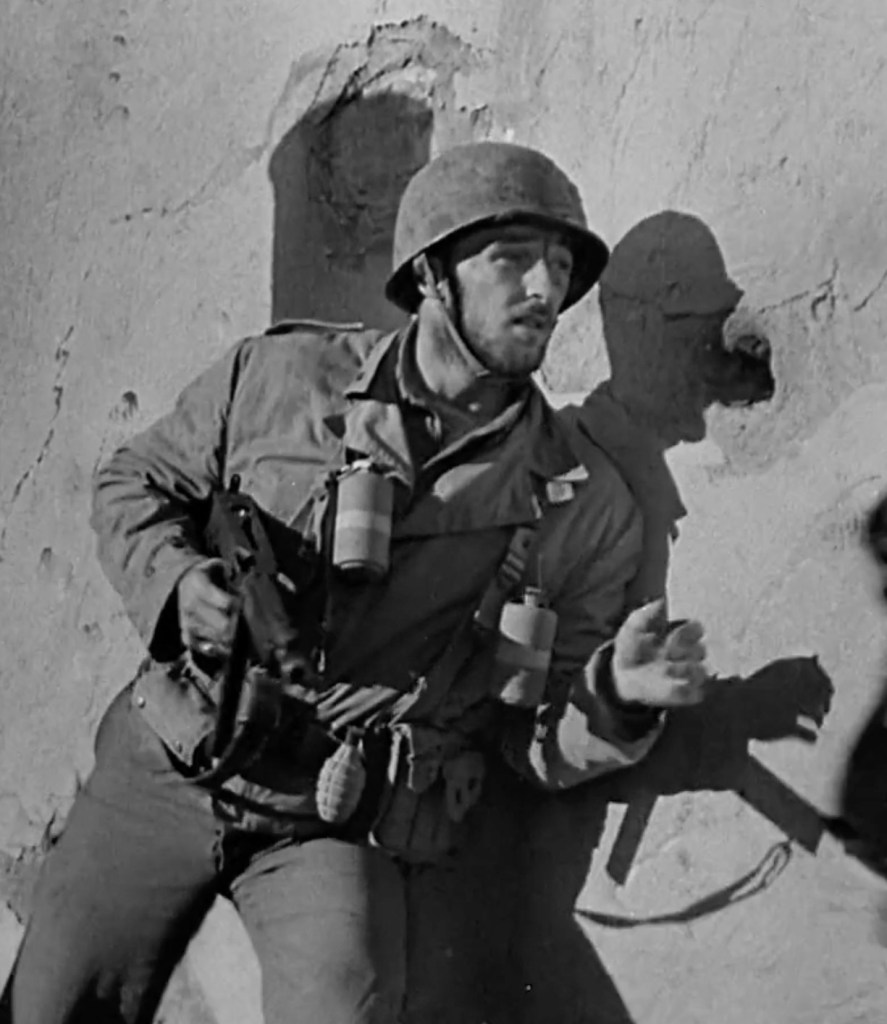 Story of G.I. Joe finds its angle in telling this story through the eyes of Ernie Pyle, the correspondent who followed soldiers into the trenches throughout World War II, documenting the war firsthand (although not specifically credited in the film, many of his writings serve as direct sources, including his 1943 book Here Is Your War and a column titled “The Death of Captain Waskow”). Pyle is portrayed by Burgess Meredith, a performer as appropriately low-key as his subject. A combat novice, the film begins with Pyle dropping in on the 18th Infantry’s Company C, led by Lieutenant Bill Walker (Mitchum) a group of rookie soldiers who quickly become hardened to the ravages of war as Pyle follows them through battles across Tunisia and Itay.