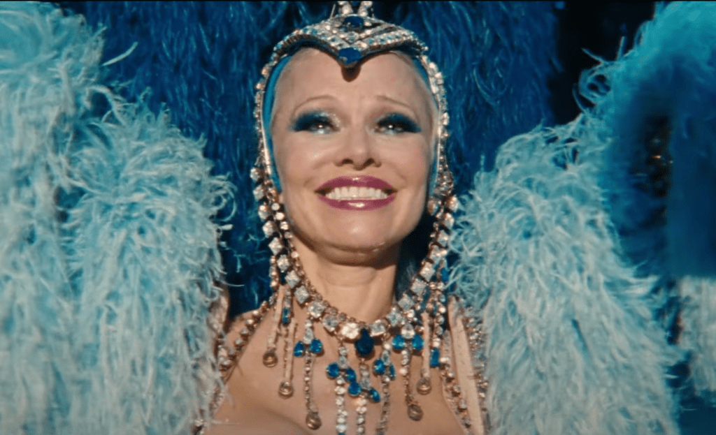 It’s an on-the-nose reference, but still an appropriately pointed one when it comes to Shelly, a 57-year-old dancer in a Follies-esque show on the Vegas strip called Razzle Dazzle. Director Gia Coppola’s film boasts a screenplay by Kate Gersten based on her own unpublished play Body of Work, inspired by her own observations of the long-running Vegas show Jubilee! just prior to its permanent closure in 2016. Razzle Dazzle has similarly been a fixture since the 1980s, Shelly having been with the show for the last three decades of her life. It’s, as they say in the film, the last show of its kind on the strip, a vestige of the old Vegas: scores of women prancing across a stage in a assortment of sparkly bustiers and feathery headdresses. But its nostalgia factor hardly compensates for the changing times, and Razzle Dazzle is being pushed out in favor of shows that contain more nudity, lewd dancing, and sexually-explicit acrobatics. At a dinner gathering early in The Last Showgirl consisting of Shelly, her younger Razzle Dazzle colleagues Mary-Anne (Brenda Song) and Jodie (Kiernan Shipka), and her showgirl-turned-cocktail waitress friend Annette (Jamie Lee Curtis), the revue’s producer Eddie (Dave Bautista) drops the bomb: the official announcement of the Razzle Dazzle’s final show in just a couple week’s time is imminent. And for the first time in 30 years, Shelly— who threw everything into her art— is facing an uncertain future.