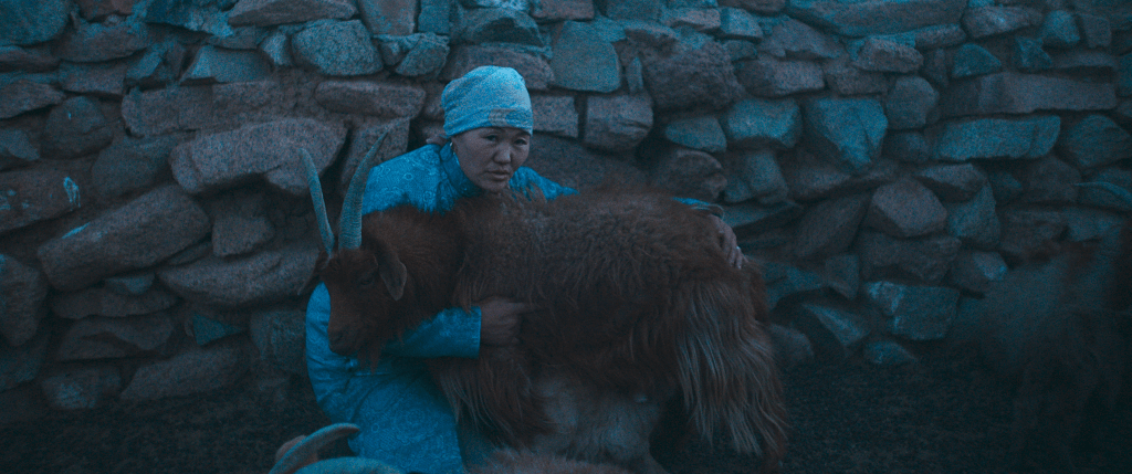 The double meaning behind director Gabrielle Brady’s film really only becomes apparent once the narrative shifts. The Wolves Always Come at Night follows Davaa and Zaya, a couple of Mongolian herders eking out a life for themselves, their four children, and their animals in the Gobi Desert. Their care for their livestock is apparent in the care they show them (Davaa tenderly assisting in the birth of a baby goat) and the long, contemplative shots of Davaa riding his horse across the vast landscapes, or the pair herding their cattle, that highlight the blissful (if not exactly easy) nature of their lifestyle. Their primary concern is the predators that may arrive in the middle of the night to hunt their animals. That is at least until a different sort of beast arrives: in a devastating example of climate change’s brutal effect on the Bayankhongor region, their herd is wiped out by a sudden sandstorm.