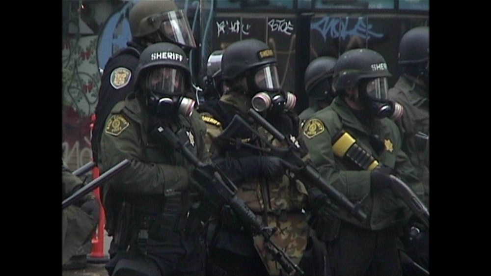 Astonishing, incendiary, and eerily prescient, Ian Bell’s documentary WTO/99 may depict one single event in American history, but does so in manner that reveals the ripple effects that globalization and anti-environmental, anti-labor practices— far from mainstream, hot button issues at the brink of the new millennium— have had on our current climate, economic, and human rights crisis, and how rampant police militarization in the face of opposition escalates peaceful situations, placing human lives and First Amendment rights in danger. That event was the 1999 Seattle WTO Protests, sometimes referred to as the Battle for Seattle, in which no less than 40,000 demonstrators gathered in the vicinity of the World Trade Organization Ministerial Conference of 1999 to protest U.S. involvement in the fledging organization, whose undemocratic nature is reflected in its membership built from non-elected leaders harnessing their authority to enact free trade. Bell, a Seattle native, constructs his film exclusively from over 1000 hours of archival footage culled from news broadcasts, press conferences, home movies, and more, providing a thorough and immersive look at the event from its lead-up, the duration of the four day conference (which occurred between November 30 and December 3), and its aftermath.