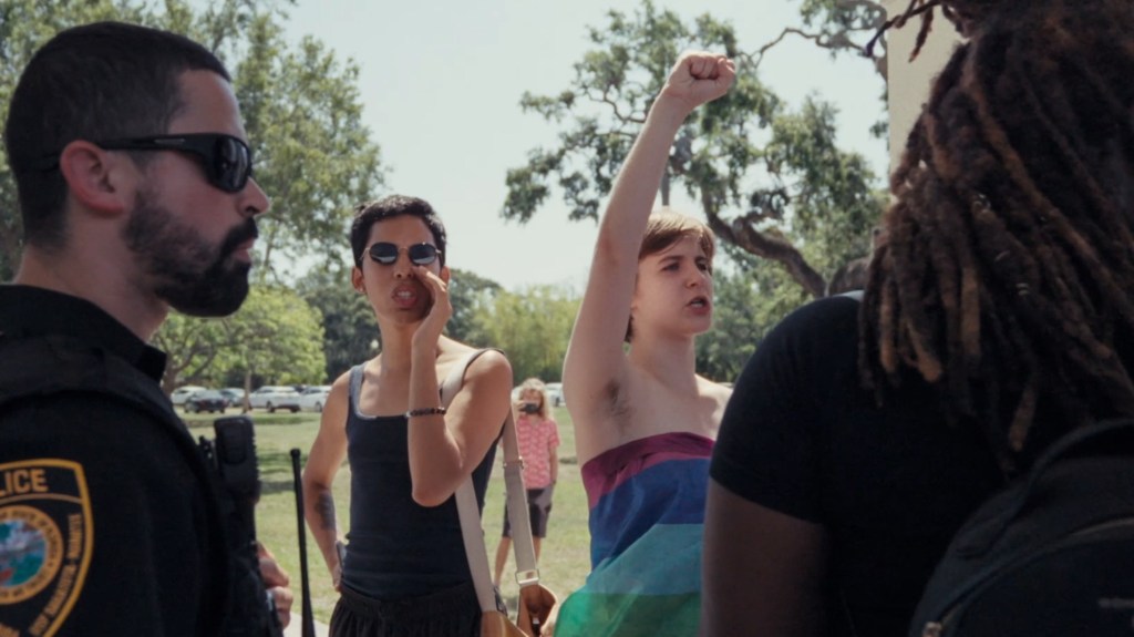 Bresnan may be the film’s credited director, but the close working relationship he established with New College’s students and staff comes through on screen. According to him, the students shot about 100 hours of footage themselves; as such, the documentary is not only able to venture into more intimate, closed-off moments, but also able to grant the students the opportunity to tell their own story. They may not be filmmakers— in one early scene, Gaby (one of the core students the film follows), voices her doubts about how to work the camera as she’s shooting— but they transport viewers straight to the heart of their fears, anger, drive, and even joy. Toward the end of the film, a group of students mount a production of The Rocky Horror Picture Show, allowing many of them to express themselves in spite of the current administration’s attempts to suppress them. Many scenes are set during meetings of the school’s newspaper, the students hashing out the events unfolding on campus while their teacher encourages them to pursue stories, but never without sacrificing journalistic integrity. It’s integrity in the face of everything thrown at them that these students and staff exhibit. None of them asked for this, but instead of just taking it, they rose to the occasion. First They Came to My College follows a lot of characters without really settling on a few central protagonists, which causes its perspective to feel a bit scattered. Some figures, like the parents, for instance, fade out of the picture after the start of the film. But that also effectively illustrates the collective effort of those opposed to the takeover. The film stacks up an infuriating amount of evidence throughout its runtime, and concludes with the assertion that what happened at New College serves as the blueprint for similar right-wing takeovers occurring at schools across the country. You may not think something like this could ever happen at your university, but as we see with New College, it very well could. That’s upsetting, but Bresnan’s film works as a rousing call to action, serving as just an effective a blueprint for how to fight back.
